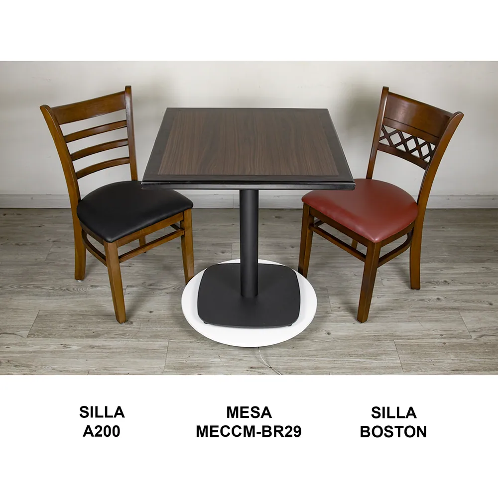 La Mesa Canto de Madera MECCM-BR29 para Restaurante de 80×80 cms se fabrica en Madera MDF y Forrada en Laminado de Formaica con canto en Madera maciza. Su base BR29 destaca con un diseño semicuadrado de líneas curvas, construida con acero de calibre industrial. disponible en color negro y cuenta con regatones niveladores.