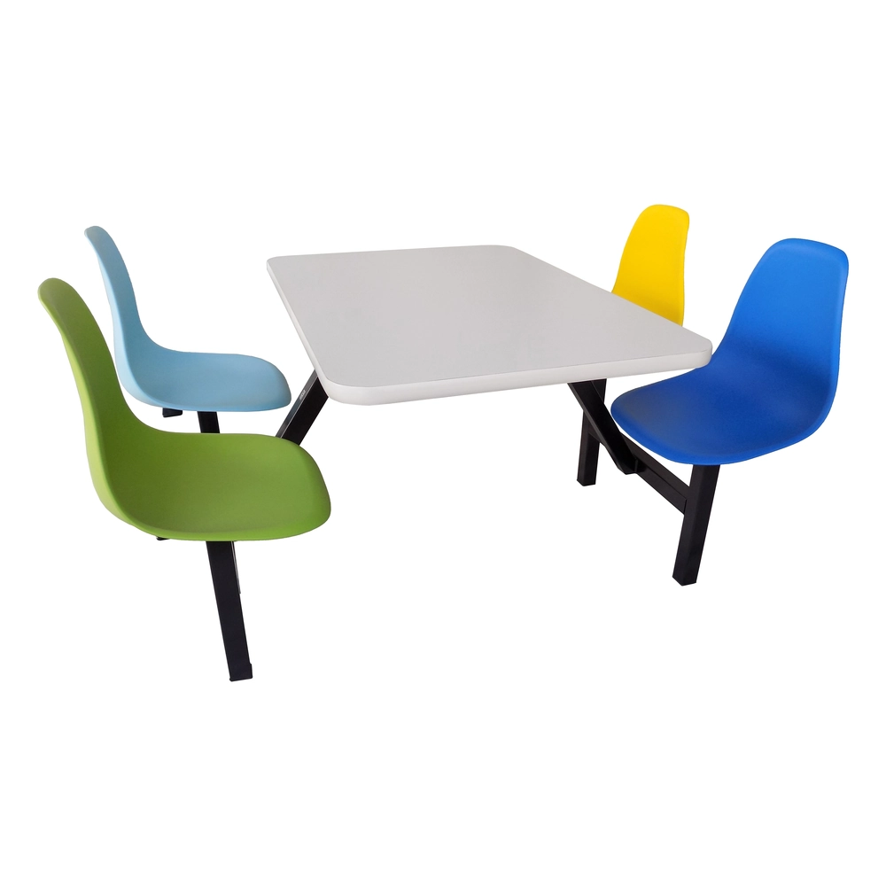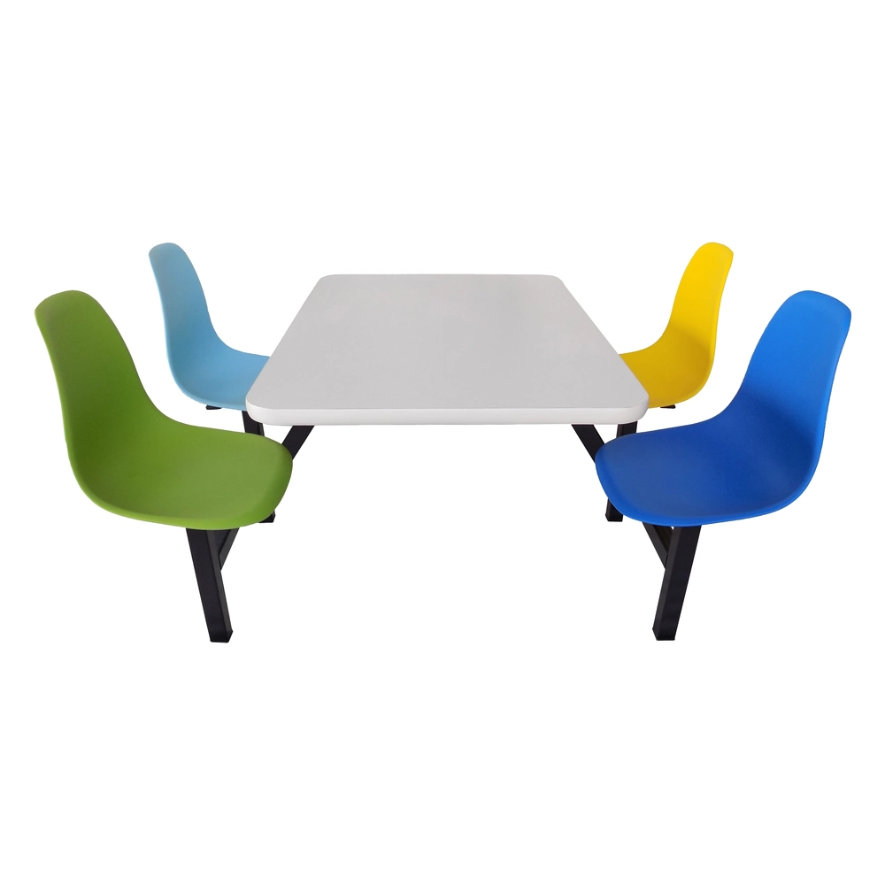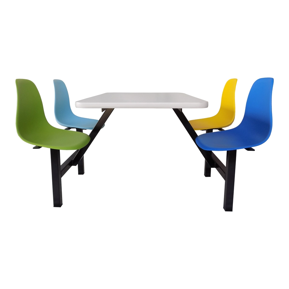 Esta mesa fast food con asientos integrados es de un diseño moderno y llamativo, con cómodos asientos de polímero sintético y en el color a su elección. Puede ser movible, lo que facilita la limpieza, o preparados para fijar a piso (Bajo solicitud expresa).