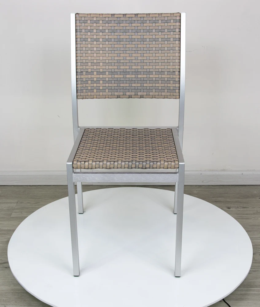 La Silla de Aluminio Tejida SR-3073 para Restaurante y Cafetería, se fabrica completamente en Aluminio natural terminado cepillado. Su asiento y respaldo son tejidos de PVC tipo Ratán color Roble jaspeado.